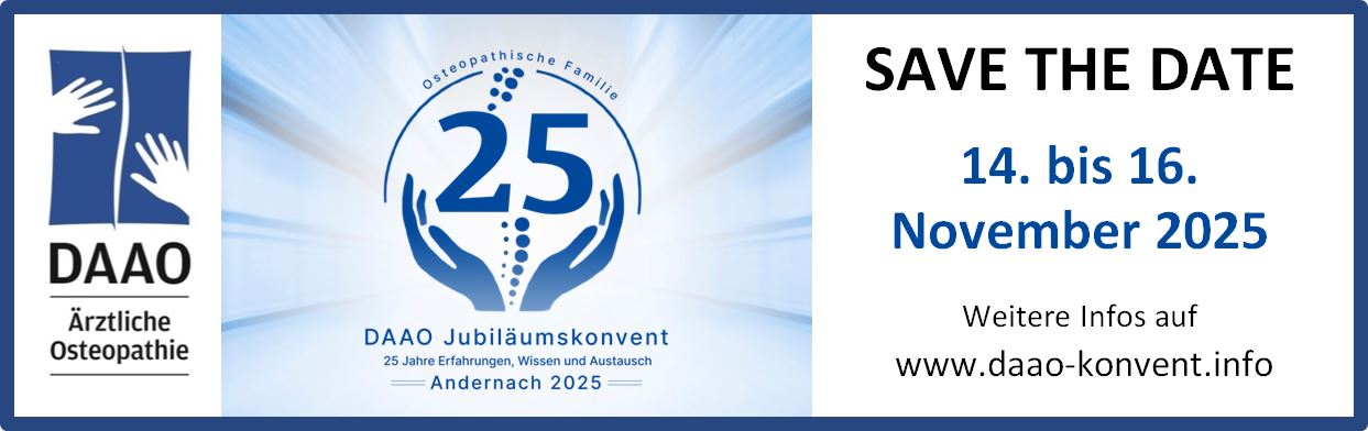 Wir freuen uns sehr, Sie heute schon auf den Jubiläumskonvent der DAAO – Deutsch-Amerikanische Akademie für Osteopathie aufmerksam zu machen. Unter dem Motto „25 Jahre Erfahrungen, Wissen und Austausch“ erwartet Sie ein hochkarätiges Programm mit Vorträgen, Workshops und interdisziplinärem Austausch.